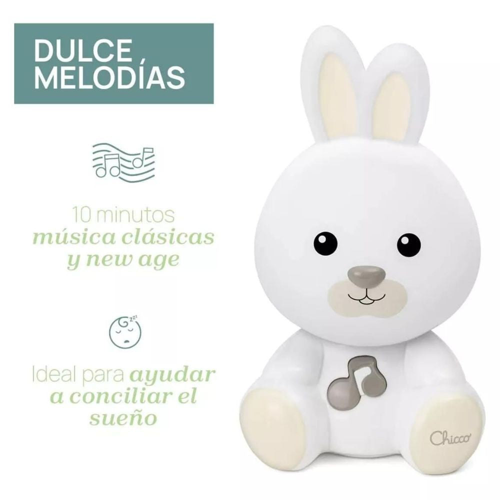 MELODÍAS: Al pulsar la nota sobre la barriguita del conejo se activan 10 minutos de música clásica y melodías modernas que acompañan al bebé durante los primeros momentos de la hora de dormir, creando una atmósfera serena y tranquilizadora.