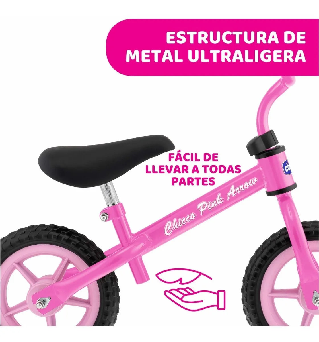 La bicicleta de equilibrio Chicco Pink Arrow es una primera bicicleta; ayuda al niño a adquirir el equilibrio necesario sobre dos ruedas para facilitar el paso a una bicicleta real con pedales. Fabricado en un metal ultraligero, tiene manillar y asiento regulables en altura para adaptarse a la altura del niño.