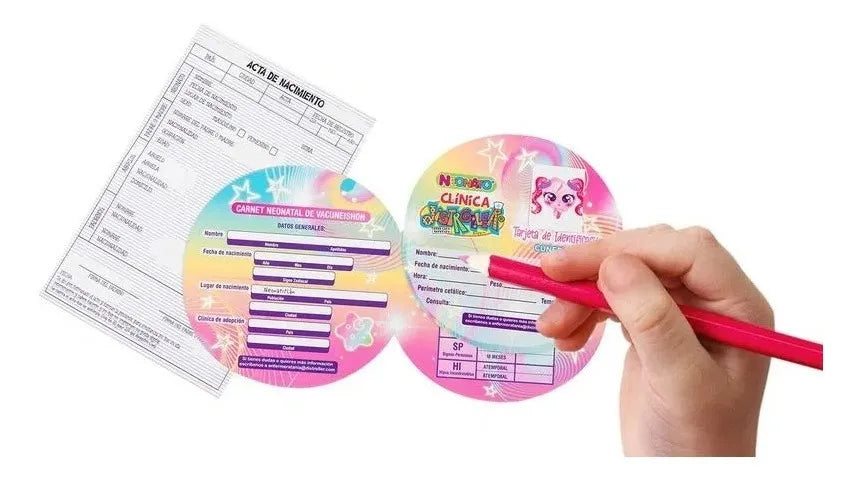 Contenido:13 piezas; 1 muñeco, 1 pañal, 2 moños, 1 cordón umbilical, 1 sorpresa, 1 chupón, 1 toalla, 1 acta de nacimiento, 1 foto, 1 cartilla de vacunación, 1 credencial de cunero, 1 instructivo de juego.